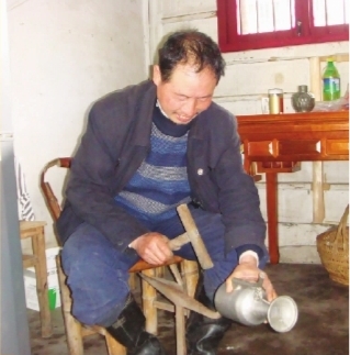 精美的锡器是如何打制出来的呢?打锡工艺流程比较复杂,主要有溶解与压片,裁料与造型,焊接、打磨与装饰等7个步骤。只见石满田升起火炉,拉开风箱,在炉子上用锅把锡化成锡水,然后把两块裱糊着报纸的铁板对合着,裱纸的一面朝里,在两块板之间压着一根绳子,把绳子圈好,绳头留在板外,把锡水由绳口倾倒进去,两块一夹,就成了锡片。接着,他根据所做器具的形状,用圆规在锡片上画圆后,将锡片剪好,经过锤打,打出初步的形状,接着用烙铁焊好接缝,再放到铁砧上反复敲打,最后抛光。如果是比较精巧的锡器,成型后还要用刮刀刮一遍,用砂纸打一打,使表面光亮平整。