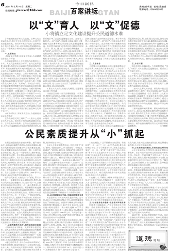 3.深入开展主题教育活动。先后开展了“双心”教育、“民生在我心,我为民生行”、“两提高,两满意”、“树形象、转作风、强服务”等主题教育活动,通过书写对联、发送短信等形式进行宣传发动,引导村民积极参与道德实践,文明意识在村民中入脑入心。特别是开展以“四讲四突出”为载体的实践活动:一是讲社会公德,突出“守规矩”,以交通秩序整治为突破口,在全乡广泛宣传、普及现代文明礼仪常识,全面强化公德意识,引导广大市民主动审视自己的行为,把文明礼仪转化为自觉行动。二是讲职业道德,突出“负责任”,以爱岗敬业教育为重点,引导培养从业人员的良好职业操守,爱岗敬业、诚实守信、踏实肯干、乐于奉献,塑造文明新农村新形象。三是讲家庭美德,突出“会感恩”,以伦理教育为重点,积极倡导人伦孝道,共创文明家庭,促进家庭和美、邻里和睦、人际和谐。四是讲个人品德,突出“有良知”,以学习和发扬道德模范的先进事迹和崇高精神为重点,引导全社会成员自觉加强道德修养,不断提高个人素质和品格。
