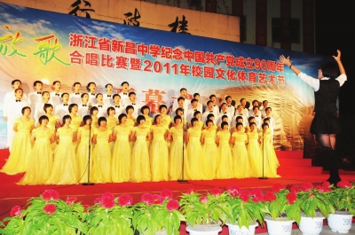 新昌新闻网记者杨玉墀摄影报道 10月8日晚,新昌中学举行纪念中国共产党成立90周年“十月放歌”合唱比赛暨2011年文化体育艺术节开幕式,学生们放声高歌,用嘹亮的歌声一起歌颂伟大的党。县领导陈泉标、潘岳梦、徐建璋、丁虹出席开幕式并观看演出。