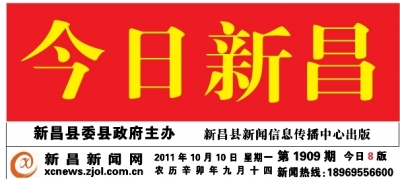 2011年10月10日 星期一 农历辛卯年九月十四 新昌县委县政府主办 新昌新闻网 xcnews.zjol.com.cn 新昌县新闻信息传播中心出版 第1909期 今日八版 新闻热线:18969556600