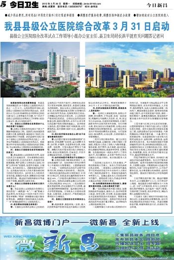 答:县级公立医院改革是事关千家万户健康幸福的民生工程,是医药卫生体制改革的重中之重。按照省委、省政府关于医药卫生体制改革的工作部署,新昌县被列为浙江省29个县级公立医院综合改革试点县之一,将率先开展县级公立医院综合改革试点,探索建立科学有效的县级公立医院经济运行新机制,为全省县级公立医院综合改革提供经验。