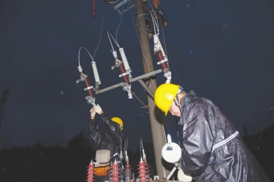 随着气候的转暖,春茶即将全面开摘。为保障今年茶叶生产用电,从去年秋季以来,县供电局全面开展电网“迎峰度茶”改造工作,对变压器进行增容升级改造,对老旧进户线进行全面加粗。图为2月21日傍晚,县供电局电力工人维修变压器。