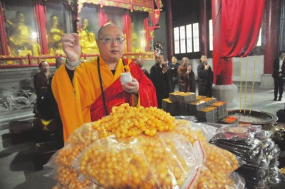 新昌新闻网记者石磊摄影报道5月8日,县旅游部门在大佛寺大雄宝殿举行旅游纪念品礼佛仪式,一批精心设计的旅游纪念品经过佛教文化的“洗礼”,融入了佛教文化元素,使纪念品更具文化内涵。