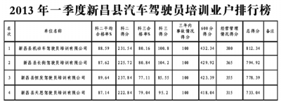 为进一步保障机动车驾驶员培训市场公正、公开、公平,促进培训工作规范化、科学化,进一步完善机动车驾驶员培训机构考核和退出机制,为拟参加培训的学员更好地提供参考依据,根据国家五部委关于《预防道路交通事故"五整顿""三加强"实施意见》等文件精神,根据各驾校的规范教学、经营行为分值和市县公安车管考试部门提供的2013年第一季度考试合格率及3年内培训的机动车驾驶员发生重大以上交通责任事故记录,我县驾驶员培训业户2013年第一季度培训质量排行榜已经揭晓,现予以公布。