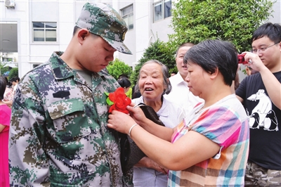 新昌新闻网记者胡秋萍摄影报道 9月6日,我县举行新兵欢送大会,64名新兵满怀豪情,带着家乡亲人的嘱托和殷切希望,奔赴湖南等地。今年是征兵时间调整的第一年,新兵的起运计划也略有提前。到今日下午,我县今年的新兵将分批次全部运送完毕。图为一位母亲在出发前帮儿子整理胸前的光荣花。
