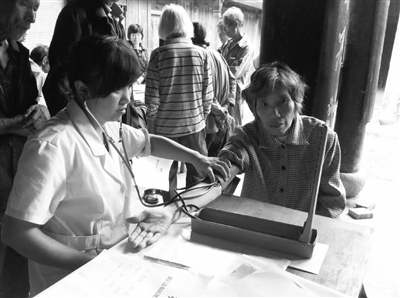 昨日,双彩乡卫生院的医务工作者来到上贝村孟仓庙,给60岁以上的老年人开展免费健康体检,项目主要包括内外科、血(尿)常规、B超(肝、胆)等。 (通讯员徐兴摄)