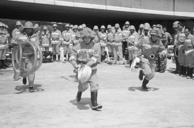 为进一步提高全镇农村消防队的灭火救援能力,近日,梅渚镇组织开展了消防演练大比武活动。经激烈角逐,铁牛村义务消防队获得了比赛的第一名。图为农村义务消防队队员正在展示消防技能。(通讯员 梁晓星 潘永辉 张美均 摄)