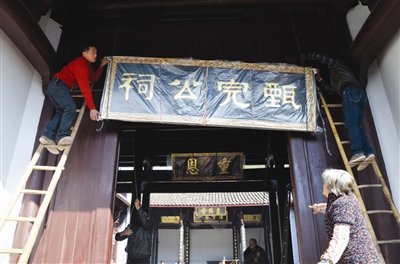 新昌新闻网记者俞晓委摄影报道 镜岭镇岩泉村甄完故里廉政文化教育基地项目自今年五月开工建设以来进展顺利,目前祠堂主体工程已完成。图为施工人员于昨日为甄完祠挂上匾额楹联。