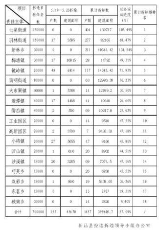 截至5月23日,今年全县累计拆除违法建筑1457户、399605.7平方米,完成70万平方米拆违目标的57.09%。现将各责任主体违法建筑处置情况排名予以通报。