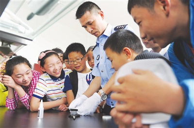 5月19日上午,凉风习习,春意盎然。实验小学五(3)班书香中队的小朋友们在家长的带领下,应约来到县公安局侦查中心。民警首先带领他们参观了侦查中心的办公设备、警用装备,随后又用多媒体课件为学生们上了一堂生动的安全课,并现场演示了一项科学实验。活动结束后,同学们仍觉得意犹未尽,脸上露出了依依不舍的表情。