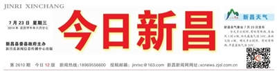 2014年7月23日 星期三 农历甲午年六月廿七 第2610期 今日12版 新闻热线:18969556600 投稿邮箱:jinrixc@163.com 新昌新闻网网址:xcnews.zjol.com.cn 新昌天气 新昌县气象台7月23日发布 今天多云到阴,有时有阵雨,东南风3到4级,白天最高气温34℃,森林火险4级。明天多云到阴,有时有阵雨,早晨最低气温26℃。