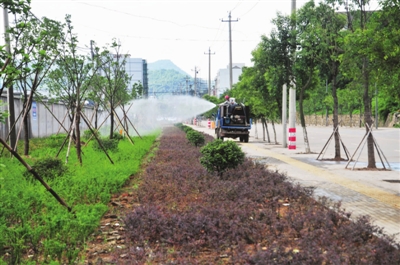 7月23日,记者在蛟澄公路澄潭段见到,一辆洒水车正缓缓行驶在主干道旁,园林工人正在给花木浇水。据介绍,这批花木是今年春种下去的,因为照料得好,花木的成活率很高,长势不错。不远处,几位清洁工正在清理垃圾桶里的垃圾,准备集中起来运往县环卫处的垃圾压缩点打包。道路上基本不见了塑料袋、饮料罐。