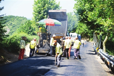 新昌县新闻记者石磊 通讯员俞晨莺摄影报道 夏季高温是浇筑沥青、修补路面的黄金季节。7月22日,在县道澄儒线,10多位公路养护工人顶着烈日正在进行路面大中修工程的沥青摊铺作业。据悉,今年我县公路部门将对41公里农村公路路面实施大中修工程,目前形象进度已达45%。