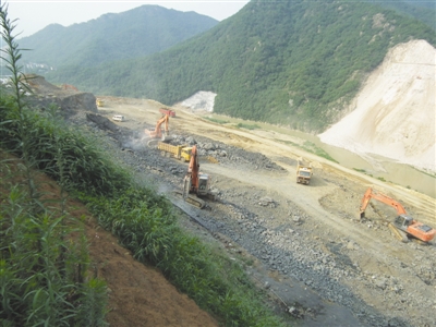 根据10月围堰截流的总体目标,钦寸水库各项工程正加紧施工。截至目前,大坝枢纽工程生产区及生活区临时建筑设施已完成;右岸坝肩106米高程以上土石方开挖完成;溢洪道已完成106米高程以上土石方开挖。图为来往挖机和大卡车正在清运坝肩挖下来的土石方。 (通讯员 顾芳晖 摄)
