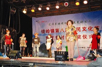 新昌新闻网记者胡秋萍摄影报道 10月23日,镜岭镇第八届农民文化节在该镇溪西村举行,来自该镇各个村的农民文艺爱好者结合当地实际,自编自演了包括小品、莲花落、排舞等多个节目,为广大观众送上了一场丰富多彩的视听盛宴。图为溪西村根据真实事件自编自演的小品《溪西村事》,引起大家共鸣。