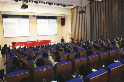 新昌新闻网记者杨玉墀摄影报道 昨日下午,全国著名儿童文学作家、《淘气包马小跳》《笑猫日记》系列作品作者杨红樱在县图书馆报告厅举行了一场别开生面的儿童文学报告会,来自城区各中小学的280多名师生聆听了她的讲座。报告会上,杨红樱饱含深情地讲述了自己走上文学道路的成长经历,并与学生们进行了精彩的互动交流。
