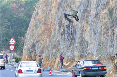 新昌新闻网记者石磊 通讯员俞晨莺摄影报道 104国道会墅岭段地处山区,公路两侧施工创面较多,随着时间的推移,岩石风化日趋严重,边坡表面常有风化的岩石掉落到路面上,影响行车安全。县公路段积极争取上级部门支持,于11月初启动公路安保工程,对9处边坡进行集中整治。截至目前,工程建设形象进度已达80%,预计本月底能全面完工。图为施工人员在进行SNS柔性挂网防护作业。
