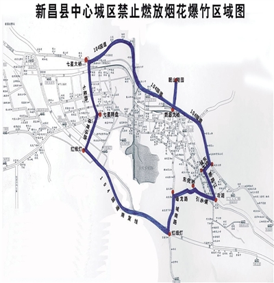 七星大桥——104国道——城东大桥(南)——新昌江——冷湖——引水渠——湖莲潭东风桥——蟠龙路——城南路——104国道南复线——体育场路——七星转盘——七星大桥(以上地段的右侧区域);新昌大桥至眠山陵园路段。(具体见禁放区域图)