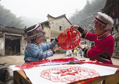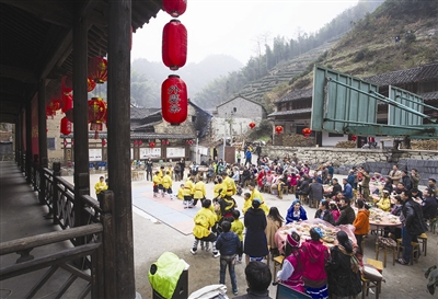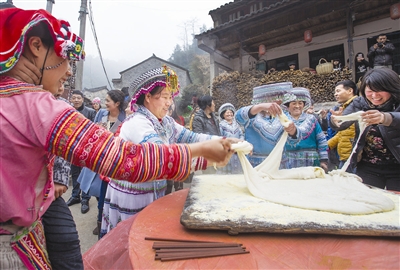 外婆坑村是“江南民族第一村”,目前生活着来自苗族、白族、傣族、瑶族等10个少数民族的媳妇。当日,这些少数民族媳妇和村民们一起忙着捣麻糍、包粽子、剪窗花、烹饪各具民族风味的特色菜肴……浓浓的年味弥漫在山村的每个角落。