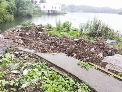 7月1日,记者冒雨来到大市聚镇西桥弄水库查看环境卫生情况,发现水面有枯叶枯枝漂浮,库边不时可见生活垃圾堆积现象,整体环境面貌有待改善。