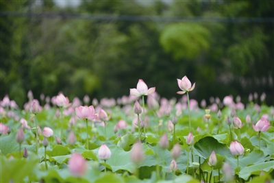 在大佛寺文化旅游区的达利·丝绸世界景区,有半亩荷塘,塘内连片的荷叶随风摆动,一朵朵粉嫩的荷花,从水中探出头来。