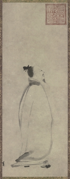 梁楷传世《太白行吟图》,立轴,纸本,墨笔,原属圆明园收藏,现为日本东京国立博物馆收藏。此图为梁楷简笔人物画的代表作之一。梁楷是一位参禅的画家,属于粗行一派。与高僧交往甚密,虽非僧,却擅禅画,能参禅入画。人物画很简单,很概括,也很生动,是一种运用粗阔的笔势和浓淡的笔墨而创作的写意画,即简笔画。《太白行吟图》就是通过这种大胆的简笔画法所绘就的,其舍弃了所有背景,仅廖廖几笔,就将“诗仙”李白纵酒飘逸的风度、才思横溢的神韵以及边行边吟的姿态刻划得生动传神,惟妙惟肖,令人叫绝。细细品读,耳边犹可听得太白天姥之吟。冥冥之中,与天姥有一种神交之缘。