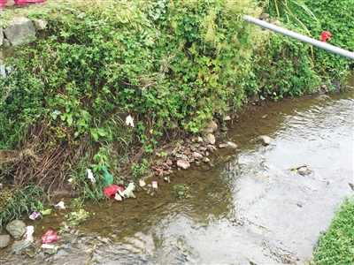 平水坑位于平水村村西。记者首先来到河道上游,发现这里水位相对较浅,远远望去,各色塑料袋、牛奶包装盒、废弃菜叶等花花绿绿的垃圾随波逐流。记者又顺着水流方向,沿河道走去,见河中一堆白色垃圾有些突兀,仔细一看是一袋包子,外面的白色塑料袋已经破损,包子在水流的冲击下一个个往外“蹿”动,并不时散发出较大的臭味,令人反胃。