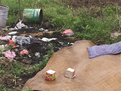 在村口的一处草坪上,只见破草席、破枕头、破衣物等生活垃圾聚集于此,其中一部分草坪已被火烧成焦灰,一眼望去,黑压压的一片。除了生活垃圾,草坪一旁还堆积了一些废弃砖块。在村口处有一个垃圾池,记者注意到,这个垃圾池内只有少量的垃圾,而在垃圾池外,烟盒、甘蔗渣、蔬菜叶等各种垃圾堆成一堆,甚至还有一张废弃的桌子赫然丢在垃圾池外,十分不美观。