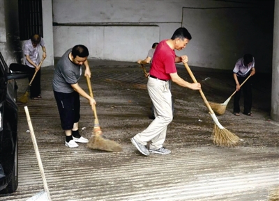 7月9日,七星社区梅园新村假日支部开展环境卫生整治志愿服务活动,组织20余名党员志愿者对梅园新村小区内的楼道、地下车库等卫生死角进行全面清理。 (新昌新闻网记者 俞晓委 摄)