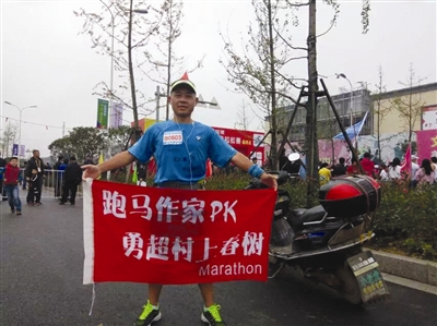 在俞永富的马拉松生涯中,离不开一个人的积极引导,他就是日本著名作家村上春树。当时,俞永富参加了鄞州区瞻岐镇一个小规模的跑步活动。比赛前组委会号召大家在分发的参赛服上涂鸦,这是马拉松活动中一项有趣的举措,人们称作“我喂自己袋盐”,意思是在服装空白处写下自己的豪言壮语,给自己加油鼓劲。见此情景,俞永富便想到了村上春树,村上春树不仅小说写得好,而且跑步也非常出色,33年间跑了30余场马拉松,实力非常强。为了勉励自己,俞永富在白色比赛服胸前写下:“村上春树跑了多少个马拉松?超越他,两三年足矣!”这场赛事后,俞永富以此心愿激励自己,不断积累比赛经验,从而达到勇超村上春树的目的。