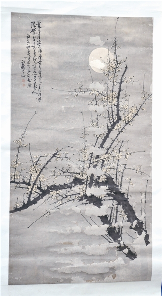 此墨梅图用笔干练老成,墨色运用丰富,构图大胆明快,将梅之雄厚清奇表现得淋漓尽致。树枝盘根错节,古朴苍劲。枝条生长茂盛,纵横穿插。枝头缀满花朵,或多或少,或开或隐,千姿百态,犹如玉珠晶莹透彻,凌寒开放,渗出一股清气。花朵分布富有韵律感,长枝处疏,短枝处密,密而有序,乱中有法,花须花英,随意点簇,笔法洒脱。玉白之花朵,铁骨之干枝,皎洁之月光,底色之晕染,互为映照,清气袭人,画出梅花之高洁品质。