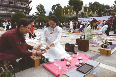 昨日,由县茶文化研究会主办的2016年九九重阳新昌“无我茶会”在中国茶市支遁广场举行,63名各地茶友自带茶叶、茶具,通过泡茶、品茶、敬茶等活动,以茶会友,弘扬禅茶文化,传承敬老、爱老、助老的传统美德。
