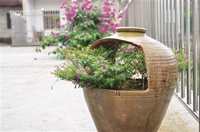 在随后的走访中,记者还在路边看到了用普通酒坛子做的花坛,巧妙利用瓦片排列出规则图案的特色小矮墙,在房屋角落间划分当作小小花园。而这些材料,都是拆自于村里平时颇为大煞风景的破倒老屋,或者是由村民自发捐赠,经一番摆弄后,一洗脏乱旧貌在新处焕发出老物身上特有韵美。