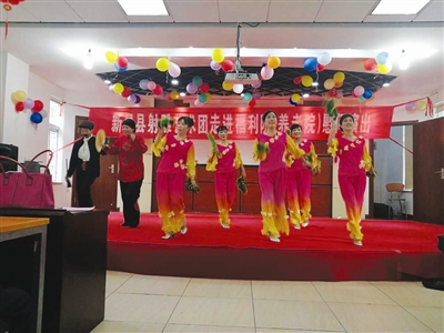 昨日,县射雕艺术团走进县社会福利院开展慰问演出,表演了歌曲、舞蹈、小品和调腔、越剧、黄梅戏、莲花落等戏曲节目,受到寄养老人们的欢迎。 (通讯员 李燕芹 摄)
