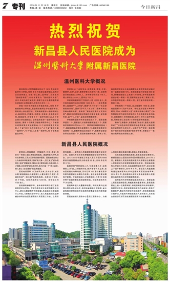 为实现医院跨越式发展,提高医院综合竞争力,根据县级公立医院改革和医疗服务需求,2015年2月,新昌县人民政府向温州医科大学提出让新昌县人民医院成为非直管附属医院的申请,得到温州医科大学的大力支持。在各级领导的支持下,经过全院上下的不懈努力,2016年8月,新昌县人民医院顺利通过温州医科大学非直管附属医院创建评审。2016年9月,温州医科大学正式命名新昌县人民医院为温州医科大学附属新昌医院。