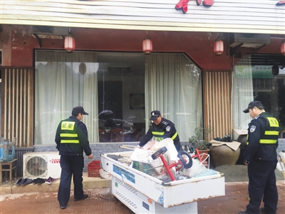 春节将至,为进一步提升市容秩序,给广大市民创造一个整洁优美的市容环境,县综合行政执法局紧抓市容管理不放松,自我加压,开展了一系列大型整治行动。图为执法人员正在帮助快餐店清理占道堆放。