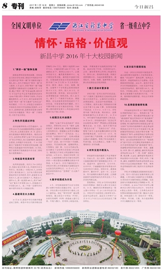 成功创建省特色示范普通高中。自学校2013年启动创建省级特色示范高中工作以来,认真落实国家、省、市、县有关深化普通高中课程改革要求,规范办学行为,全校师生贯彻“让每个学生走向成功”的办学理念,培养创新精神,提高综合素质,全面提升学校品质。于10月底接受了省教育厅专家组对我校创建二级特色示范普通高中的评估验收。12月底,浙江省教育厅批准新昌中学为省二级特色示范普通高中。