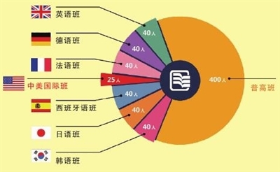 ●英语班、德语班、法语班、西班牙语班、日语班、韩语班高中学费,公费生每人每学期5000元,自费生每人每学期15000元。