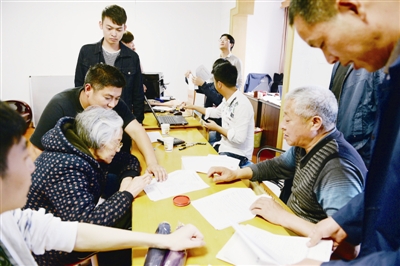 自5月1日上午《市民公园项目房屋征收评估结果公示》张贴后,拆改工作组人员加班加点开展政策宣传解释工作,广大征迁户积极配合争先签约,截至昨日下午4时,已累计签约29户。图为安全路28号户主求铨芬老人正在办理签约手续。 (记者 杨玉墀 摄)