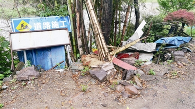 在临近新民江的路段,有一处长满了竹子,清溪、修竹,原本风景很优美。但是竹林边上堆放的废弃道路施工指示牌、零星建筑垃圾、彩钢瓦等杂物,破坏了优美的构图。一路查看,路边乱堆放现象比较普遍,有的地方堆放了旧的竹子跳簾,上面盖了油毛毡,由于堆放不规则,而且时间较长,看上去有些破旧、凌乱;有的地方则露天堆放着一些竹梢、铁皮瓦等杂物。有一块人为开垦的路边菜园,还用竹杆围了起来,用绿色的网和红白相间的彩条布作围栏,菜园中间堆放着一些木条。