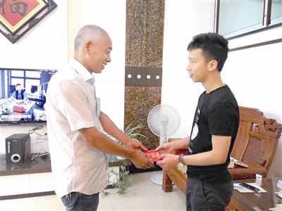 “章杰,这是村里的一点心意,希望你到了高校再接再厉,给村里带个头。”村党支部书记王相富将一个早已封好的3000元大红包递给了章杰,并勉励小伙子继续努力学习。