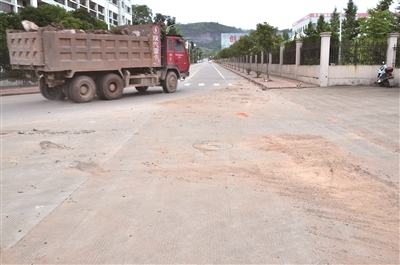 记者发现,渣土撒漏现象主要集中于亿鼎路东段及西山至宋家乡道,在路面上常能看见许多大小不一、已被压实的土块,一些路段还有许多细碎石子。据亿鼎路附近工厂的门卫介绍,自去年下半年开始,只要天气良好,便会有工程运输车经由该路段前往五联村附近倾倒渣土。“总共有10多辆车,天气好的时候从早上7点多到晚上9点多都不停。”该门卫表示,有些工程运输车其实是有顶盖的,但是因为装得太满就没盖,从而导致了渣土的撒漏。