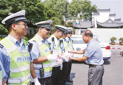 烈日下,FM93交通之声,FM94.1绍兴交通广播,县总工会领导、县世贸广场有限公司董事长潘若平、小学生、文明交通志愿者等来到交警身边,送饮料、送医药箱,帮助维护交通秩序,开展文明交通专场慰问演出,为在酷暑中执勤的交警送来了丝丝清凉。