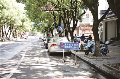在位于大佛路天姥广场特产超市门口,记者看到,在原先是停车位的地方,已放置了一块警示牌,上面写着“停车位已取消,此路段禁止停车”。不过,仍有一些车辆停在已取消的“停车位”里。