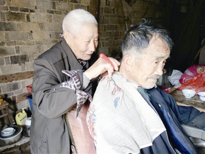 在有些昏暗的木板房里,记者看到,杨正海刚给一位顾客剪完头发,将他请到角落的水槽里洗头。这位顾客叫王雪钱,是双彩乡下岩村人,今年86岁,自称是杨正海的“铁粉”。“我们认识多年了。杨师傅剃得好,我都在他这里剃的。”王雪钱告诉记者,以前爬一条岭来新市场赶集,都会顺便在杨正海这理发。