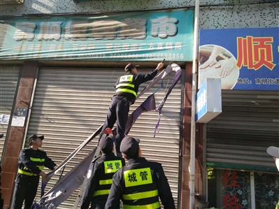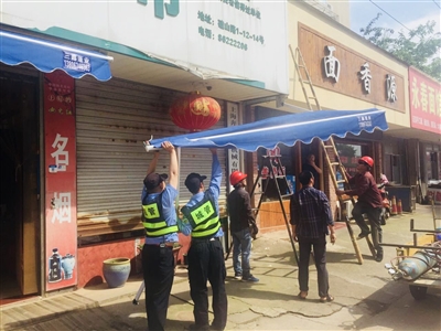 5月18日,县综合行政执法局聘请专业技术工人,对钟楼菜场西边逾期仍未拆除的雨棚予以拆除。“您好!您店门口私自搭建雨棚,请在限期内予以整改!”5月初,执法队员已对钟楼菜场周边的店家,发放限期整改通知书,在之后的日常管理中,也与店家多次沟通交流。