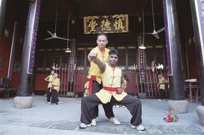 9月2日上午,从杭州前来新昌的印度友人丹尼尔,专程来到小将镇南洲村,在南洲叠罗汉第十六代传承人胡炎彬的指导下,体验、学习叠罗汉、舞狮等民间“非遗”。 (记者 俞晓委 摄)