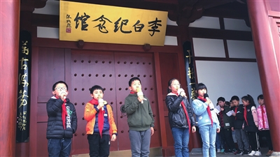 3月29日,鼓山公园迎来近百名小朋友。在这个融唐诗文化、乡土文化于一体的地标式主题公园,孩子们体验不同的自然和人文环境,感受新昌的美丽山水与家乡的巨大变化。图为南明小学三年级学生在老师组织下吟诵唐诗,演绎经典。 (通讯员 陈宇静 杨晓霞 摄)