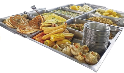 当日上午10:30,戴好口罩、做好防护后,记者被允许走进后厨,肉饼蒸蛋已经蒸好,厨房工作人员按各班人数点出相应份数,分装在盆里,放在配餐车上。“刚做好的饭菜都很烫,每顿饭都要提早晾一下,再分送到各班。”工作人员表示。