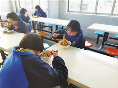 17:00,晚餐时间到,学生们涌入食堂,挑选自己喜欢的菜品、小吃。记者留意到,花色小吃窗口的队伍排得最长,每个学生餐盘里的“排列组合”都不一样。高三年级女生王杭洁买的是一份煎饺,一碗番薯粥。她告诉记者,因为食堂提供的菜品比较丰富,每个同学都能挑出自己爱吃的几款。在食堂内,一位老师带着自己上小学的儿子一起,也在就餐。该老师说,因为工作繁忙,有时会来不及做饭,经常带孩子来单位吃饭:“学校的菜品营养卫生,吃起来比较放心。”